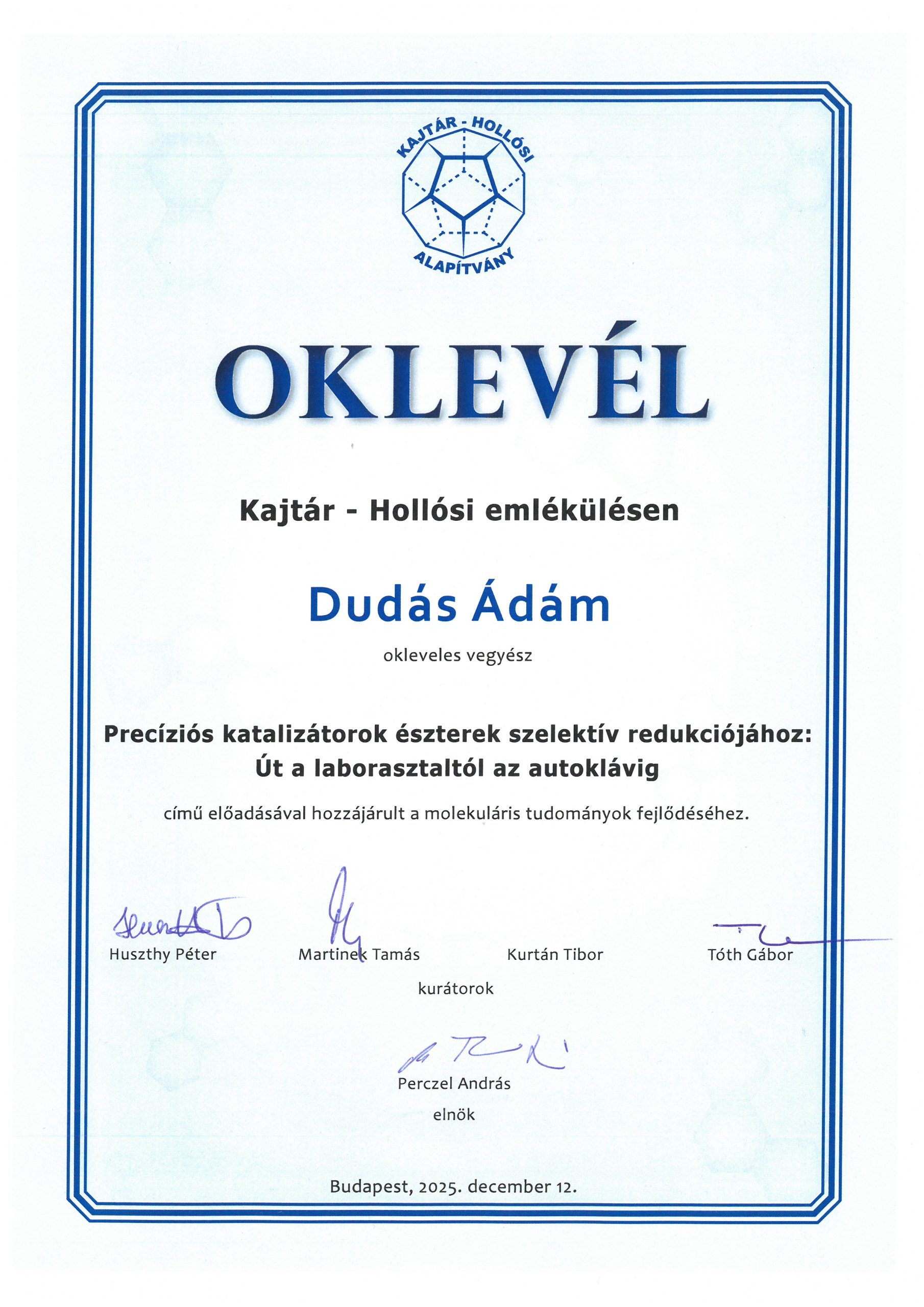 2025. december 12-én az ELTE TTK Kémiai Épületében a Kajtár-Hollósi emlékülés keretében átadták az Alapítvány díjait. Az MTA Szerves és Biomolekuláris Kémiai Bizottság és a Kajtár-Hollósi Alapítvány által szervezett emlékülésen oklevelet vehetett át Dudás Ádám, a HUN-REN TTK Szerves Kémiai Intézet kutatója is. Dudás Ádám „Precíziós katalizátorok észterek szelektív redukciójához: [...]